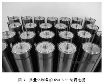 (2)在年产2MW钠硫电池能力的中试生产线上,有大量自主研发的关键设备,如陶瓷烧结炉、连续真空热压炉、气氛金属焊接、批量化真空金属焊接以及批量化电池评价与筛选系统等。在所研制的连续真空热压系统中包含了真空、加热、冷却、液压、程控、传输等九大联动系统,整个系统实现了全自动运行,其程序控制设计连锁条件超过1000余条。在解决上述关键技术的基础上制备成功容量达到650A·h的大容量钠硫电池。批量化制备的650A·h钠硫电池如图3所示。目前,钠硫电池的循环寿命达到360次以上,比能量达到150W·h/kg,电池前200次循环的退化率为0.02%/次,电池的期望寿命可达10a。目前需重点解决电池的一致性及长期稳定性问题。