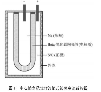 中心钠负极设计的管式钠硫电池结构如图1所示。电池以金属钠(Na)和单质硫(S)与碳(C)的复合物分别用作阳极和阴极的活性物质,Beta氧化铝(Beta-Al2O3)陶瓷同时起隔膜和电解质的双重作用。
