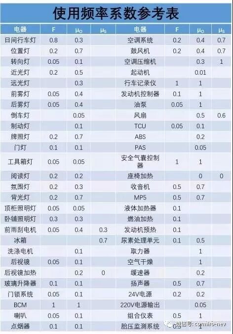 为了整车的用电量的计算分析方便,首先引入电器使用频率系数这一概念,随着季节和环境的不同,各种电器的使用频率也不同。电器的使用频率系数可以通过长期的道路行驶统计获得。汽车用电器按使用范围不同,可分为3类: