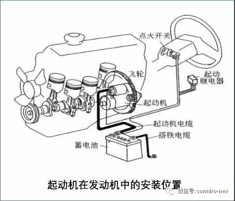起动机可以将蓄电池的电能转化为机械能,驱动发动机飞轮旋转实现发动机的起动。汽车起动机主要由直流电动机、传动啮合机构(拨叉、单向离合器及驱动齿轮)、电磁开关三大部分组成。工作时电磁开关一边拉动拨叉使驱动齿轮与发动机飞轮齿环啮合,一边使开关触点闭合,直流电机通电转动,开始起动。
