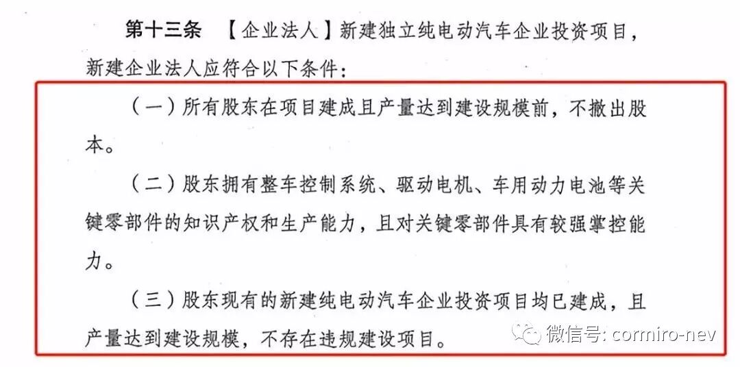 此外,发改委还对新建独立纯电动汽车企业投资管理项目的法人和股东股权做出了明确规定。比如所有股东在项目建成且产量达到建设规模前,不撤出股本;股东现有的新建纯电动汽车企业投资项目均已建成,且产量达到建设规模,不存在违规建设项目;主要股东股权高于三分之一的,自有资金和融资能力也需要满足一定条件……