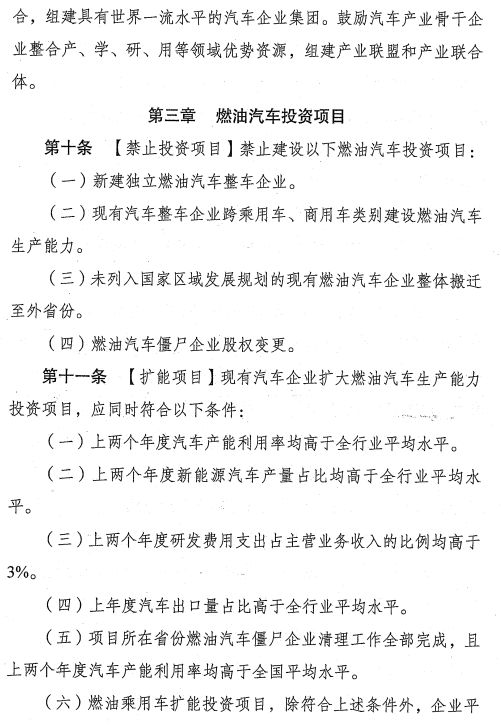 禁止新建独立燃油车整车企业,禁止现有整车企业跨乘用车、商用车类别建设燃油车生产能力,禁止未列入国家区域发展规划的现有燃油车企业整体搬迁至外省份,禁止燃油汽车僵尸企业股权变更。
