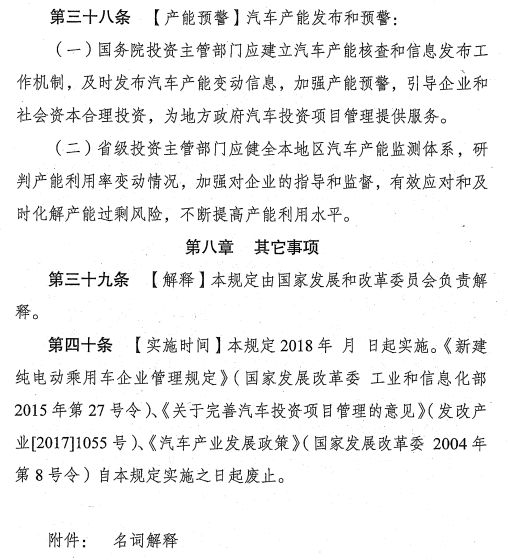《征求意见稿》称,《新建纯电动乘用车企业管理规定》(国家发展改革委、工业和信息化部2015年第27号令)、《关于完善汽车投资项目管理的意见》(发改产业【2017】1055号)、《汽车产业发展政策》(国家发展改革委2004年第8号令)在《汽车产业投资管理规定》实施之日起废止。