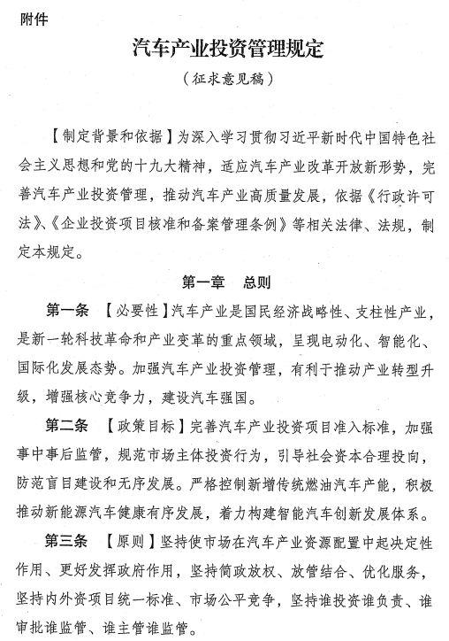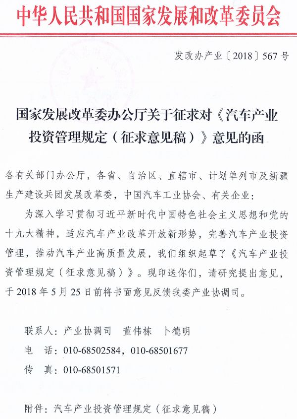 5月24日,部分地方工业和信息化委员会接到了一份来自国家发展改革委(以下简称“发改委”)下发的《汽车产业投资管理规定(征求意见稿)》(以下简称“征求意见稿”)。该《征求意见稿》要求收到此文件的部门于5月25日前将书面意见进行反馈。据悉,该政策将于2018年内公布,但具体时间待定。