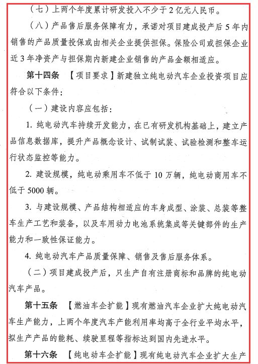 此外,《征求意见稿》对新建独立纯电动汽车企业的投资项目也提出了高要求,比如在建设规模上,纯电动乘用车不低于10万辆,纯电动商用车不低于5000辆。