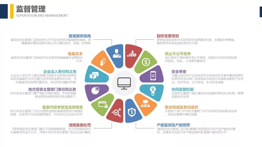 管理规定再次强调我国汽车产业电动化、智能化发展的方向,新能源汽车与智能网联汽车是我国未来汽车主流产品;同时贯彻我国十九大精神,政府持续坚持简政放权,发挥市场主导作用的原则;将监管责任下放至地方投资管理部门,提高投资项目政府审批效率,抑制地方政府的投资的冲动。